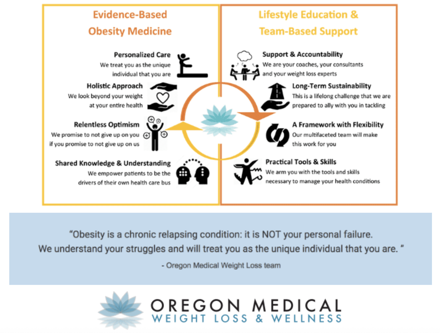 We combine evidence-based obesity medicine, lifestyle education, and team-based support that empowers patients with the knowledge and skills to improve their health conditions. Our patients lose weight and gain health.